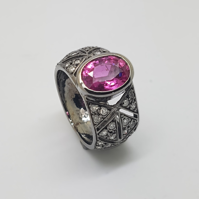ONE PINK SAPPHIRE 1.98 CARATS AND FOUR WHITE SAPPHIRES 0.550 CARATS SET IN A 14K WHITE GOLD RING