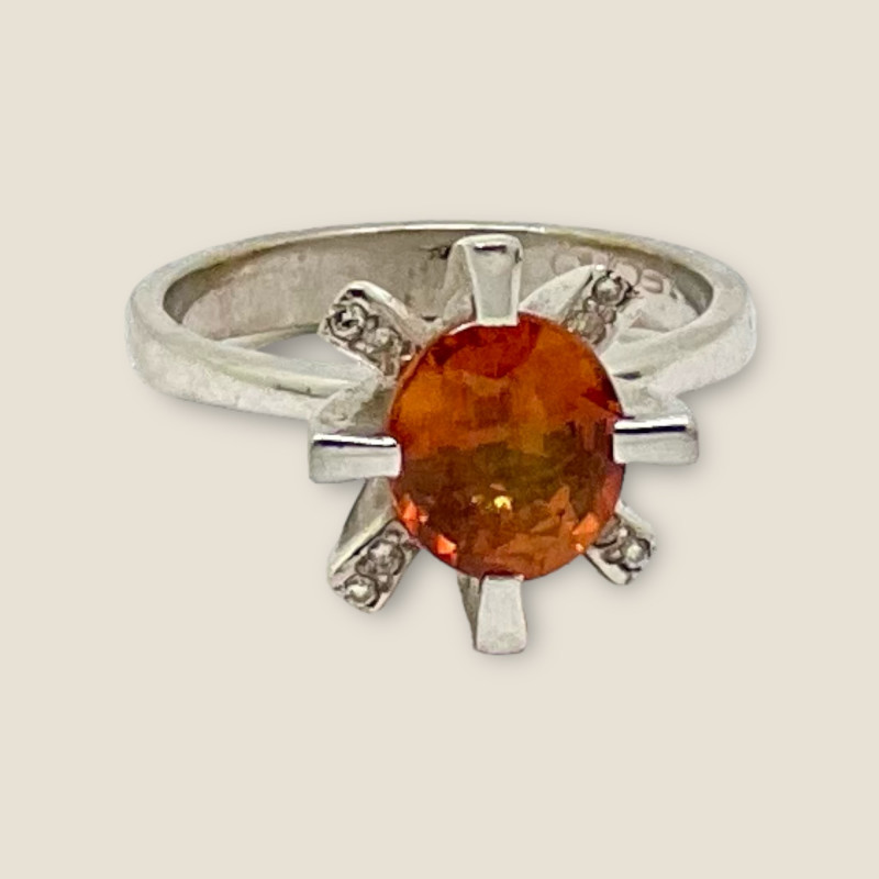 ONE ORANGE SAPPHIRE 0.95 CARATS AND TWENTY DIAMONDS 0.14 CARATS (AVG) SET IN A RHODIUM PLATED SILVER RING